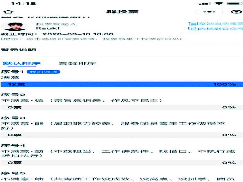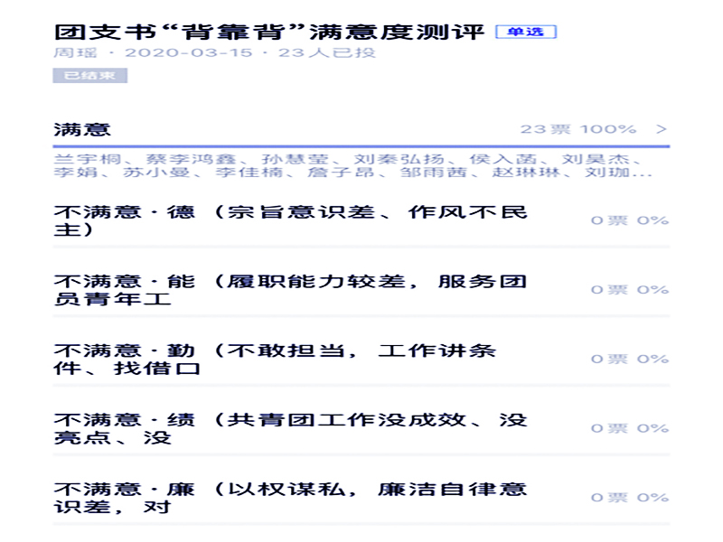 团支部书记“背靠背”满意度测评是指支部团员采取“背靠背”无记名投票的方式对团支部书记工作作出客观、公正评价。参加对象为本支部登记注册的团员,参与测评人数达到支部团员总数的三分之二及以上方为有效,测评结果当场公布。因受到疫情影响,本次测评采取线上方式召开支部团员大会。会议流程包括:“奏唱团歌、进行述职、投票测评、现场统计并公布结果、上级团组织人员或辅导员点评”等步骤。测评过程可以采取字幕、音频或视频等形式进行,团支部书记述职结束后,团员可以现场发言对其工作进行评议,“投票测评”环节通过群投票方式进行不记名投票,相关人员对投票结果进行截图。
